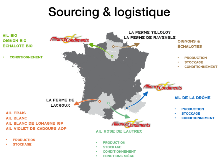 Une entreprise orientée vers la production de condiments, très impliquée dans l’amont de la filière française avec une expertise cahier des charges, implantée dans les principaux bassins de production.